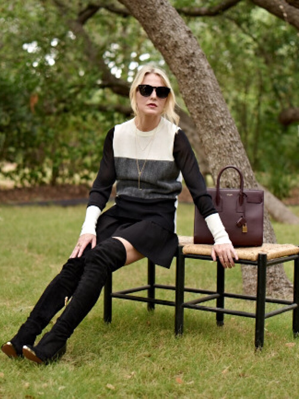 Over the knee boots, paired with a mini skirt and a sporty sweater