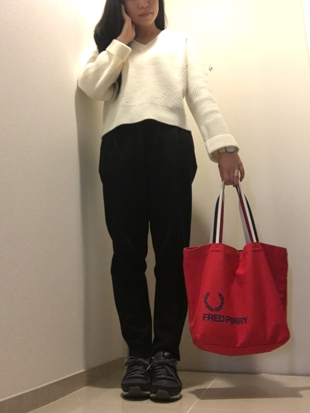 ローリーズの白ニット、フレアスリーブがかわいい♡ Vの開きも、浅すぎず深すぎず。 ショート丈なのでボトムスはハイウエストが相性🙆 差し色に赤のバッグ🔥