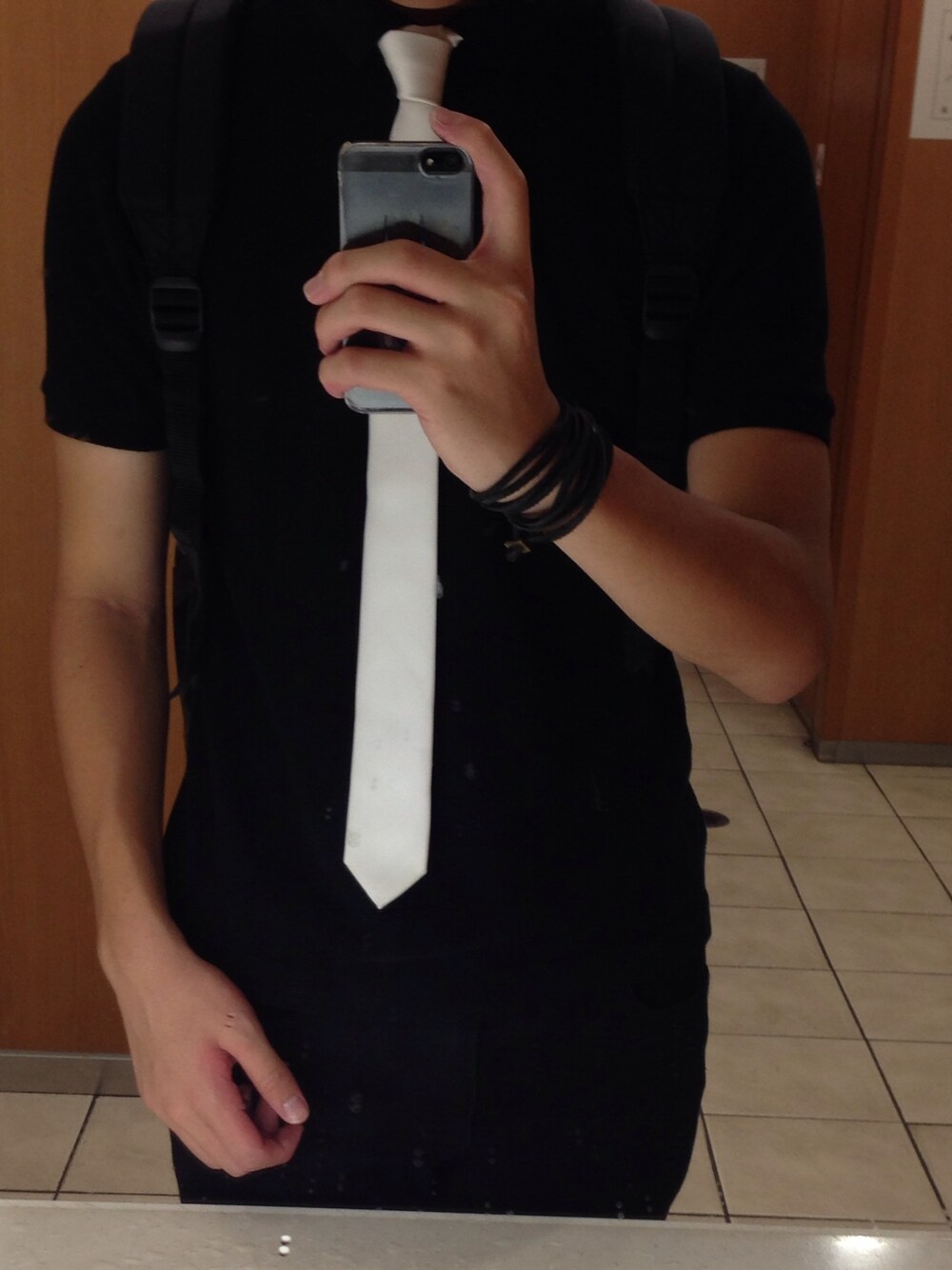 こんどは黒ポロに白ネクタイです 見えてないですが一応白のサンダルはいてます