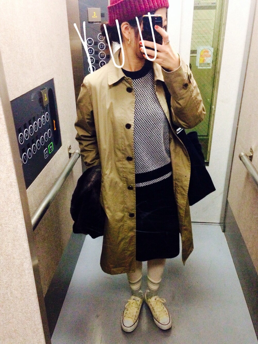 SALE初日 outer:MHL. knit:SENSE OF PLACE skirt:SENSE OF PLACE knit cap:CA4LA snood:SENSE OF PLACE sox:BEAMSBOY shoes:CONVERSE bag:marimekko