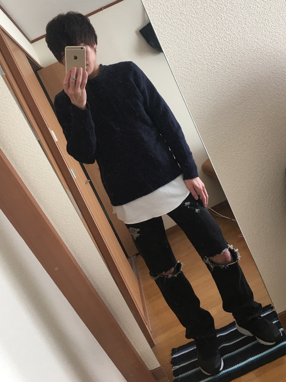 いつもいいね&セーブありがとうございます! フォロワーが一人ずつ増えていて嬉しいです😭😭😭 今日はニット×レイヤード! レイヤードによってシンプルニットもカジュアル に着こなせますね!! そして、HAREのダメージデニム!! これ超お気に入りです!!!! 膝から足先にかけてだんだん太くなっていき、 1990年代って感じでいいですよね!
