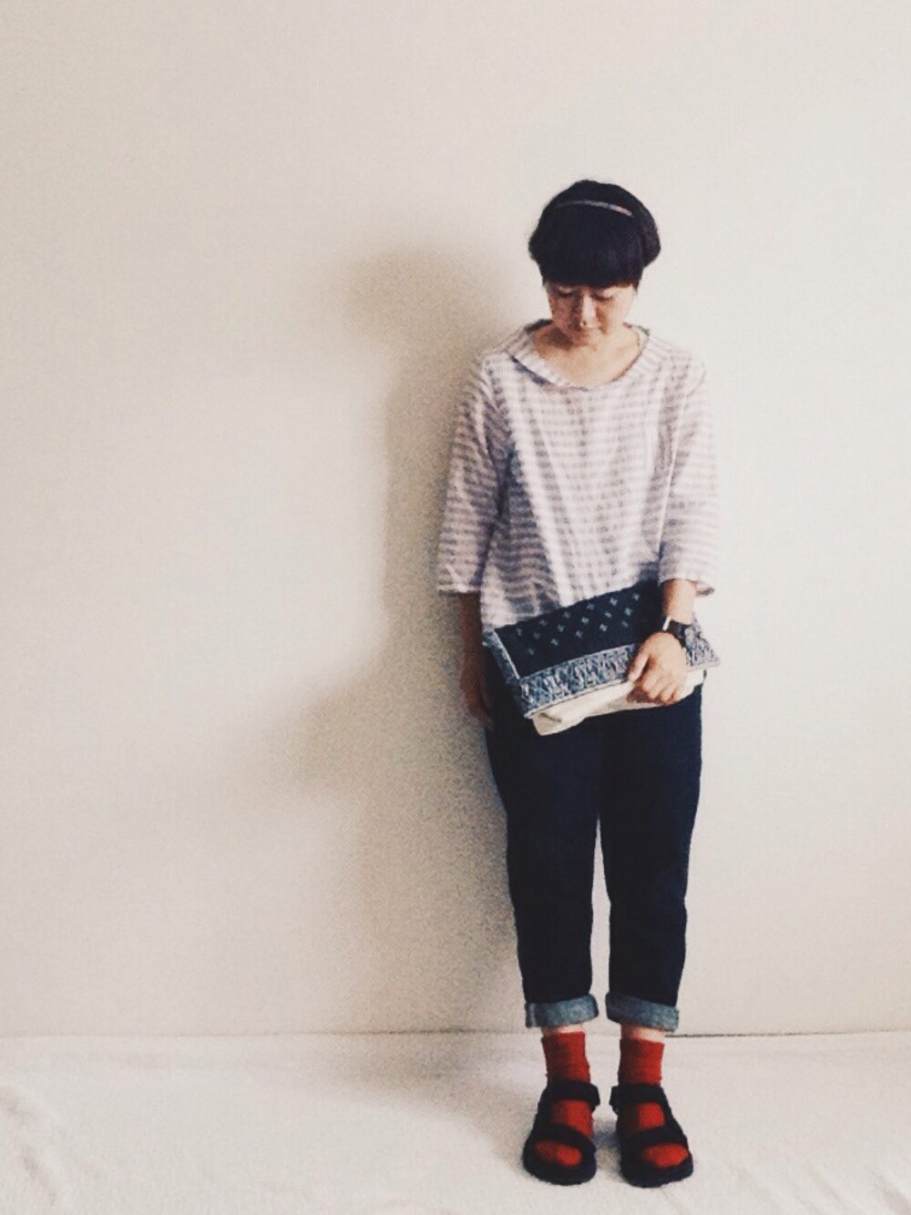 突然やって来た夏の終わり。 着るものに困るるる。 デニムパンツ、カチューシャ☞KAPITAL シャツ☞スタジオクリップ サンダル☞TeVa クラッチバッグ☞naff