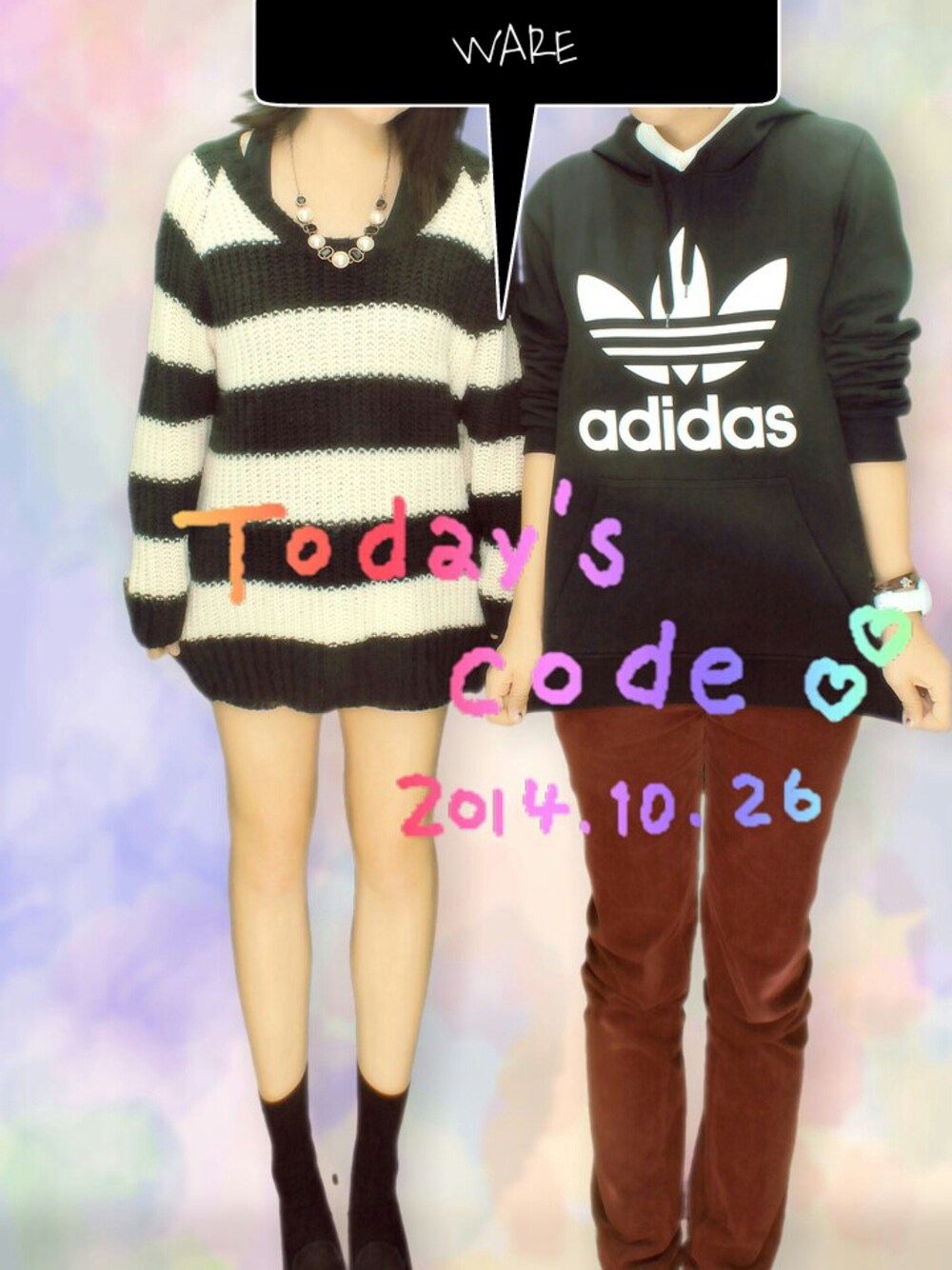 久々のware。 今日はなんかミッキーに似てる! って思いましたがそーでもないですかね。 靴黄色にすればミッキーみたいだったかもっ。 プリクラで申し訳ないです。 私は右ですっ。 足元と頭見えてないですよね。 頭はニット帽かぶってます。 足元はいつものあの迷彩ブーツです。