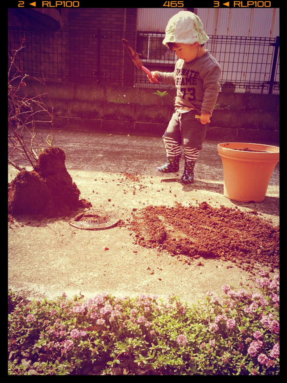手伝っているのか、遊んでいるのか、邪魔しているのか…新緑の季節に向けてばぁばのお庭をガーデニング中❁❀✺✿✾✽✽✵ ゆうたろう スウェット 西松屋 パンツ GAP 長靴 しまむら 帽子 handmade