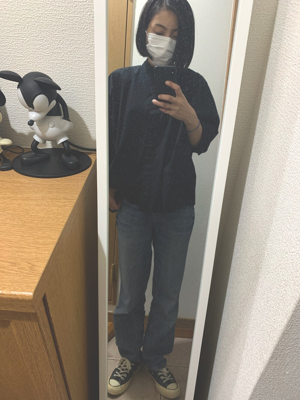 ブラック系のシャツ/ブラウス、ブルー系のスニーカーを着用したレディースの秋コーディネートの1枚目の写真