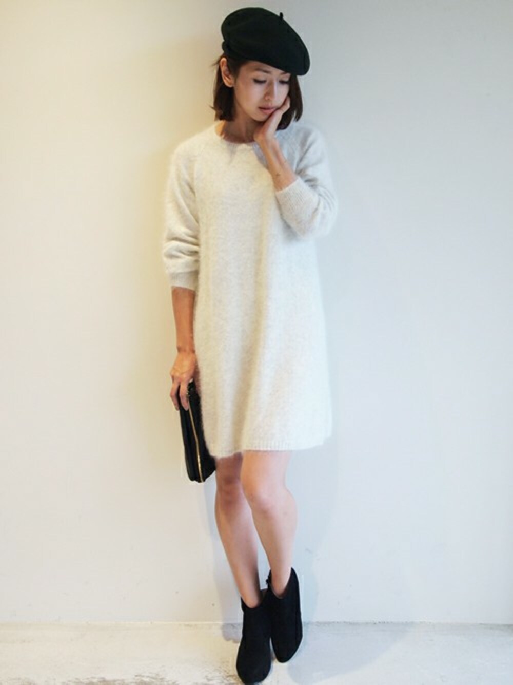 ふんわりした素材感がキュートなニットワンピをメインにスタイリングしました。 さり気ないAラインシルエットがフェミニンムードを引き立てます。 小物はブラックでまとめて、女性らしさに少しスパイスを加えたコーディネート。