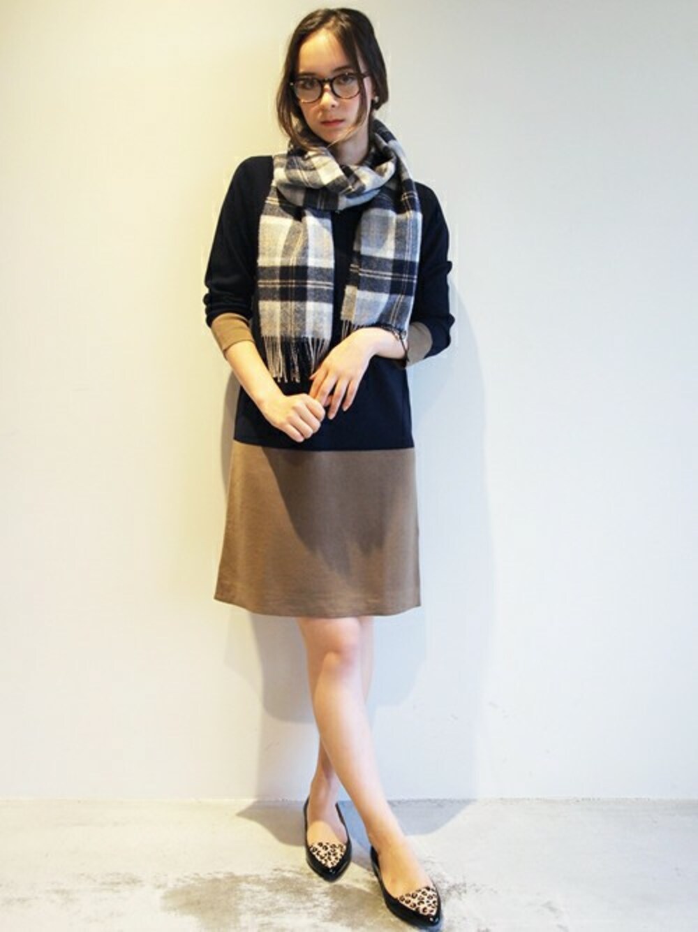 存在感抜群のバイカラーワンピをメインにコーディネートしました。 トラッドな小物のアクセント使いが、今年らしいムードをプラス。 シックな雰囲気漂う大人のワンピーススタイル。