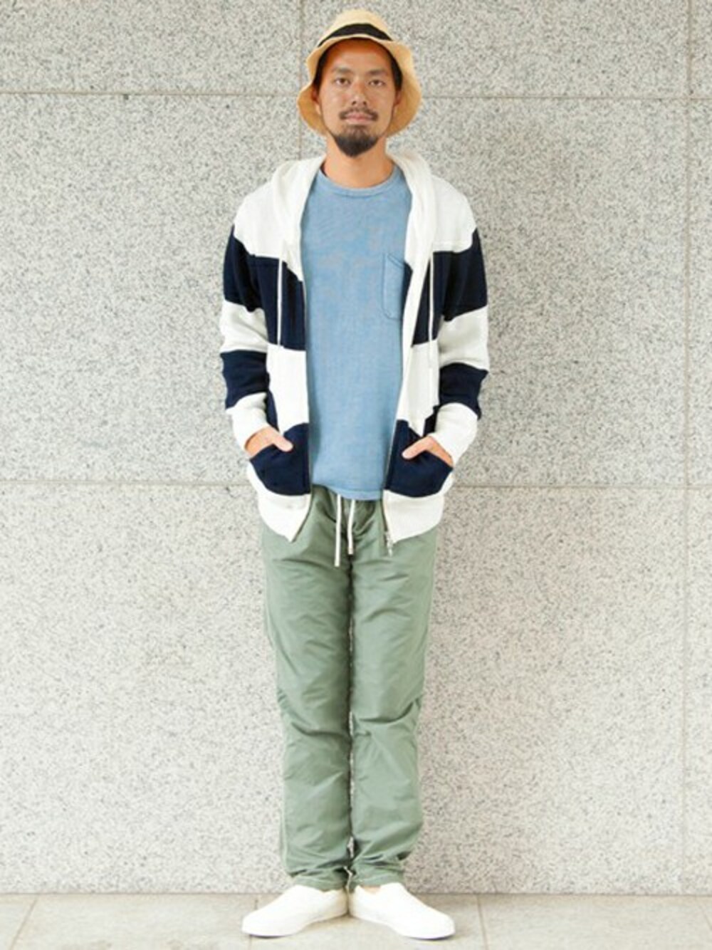 スペインにて創業されたメンズのスイムウェアメーカ<GERRY>のパンツを街履き仕様でコーディネート。トップスに着たヴィンテージウォッシュがされたニットは、大人のリラックスカジュアルにオススメです。