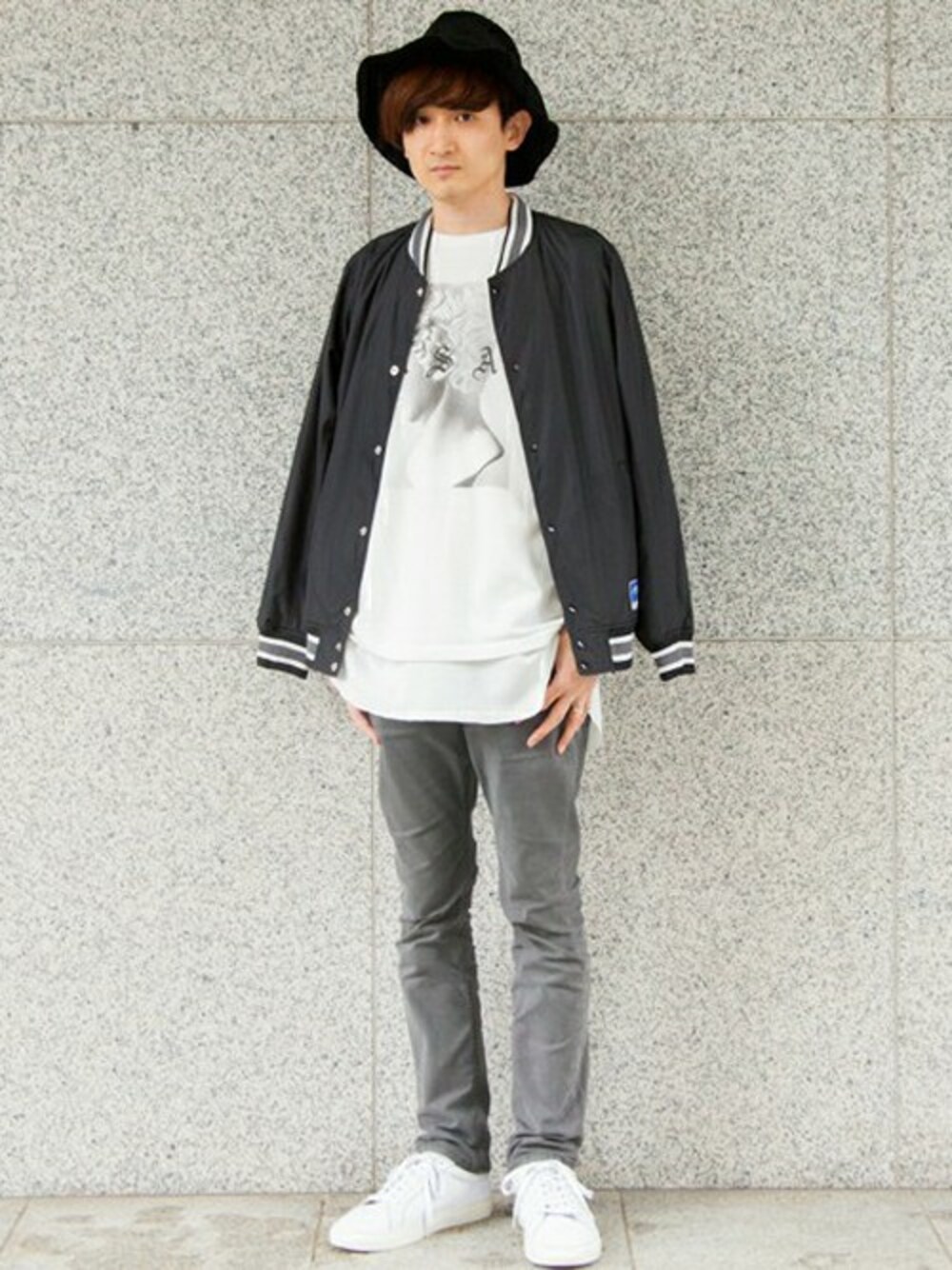 スポーティーな雰囲気のあるアワードジャケットを主役に、全体をモノトーンでまとめた<monkey time>オススメのミックススタイル。インナーに着たTEEシャツはタンクトップとレイヤードして着ています。