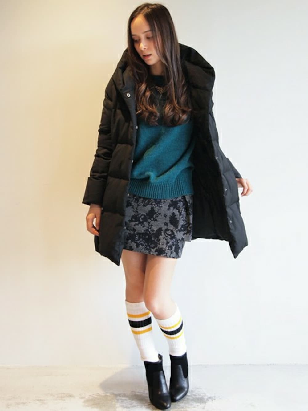 オリジナルのショールフードダウンから、ブラックをチョイスしたコーディネート。 クラシカルでシックなカラーリングに挿し色をプラスした、絶妙なミックス感がポイントです。