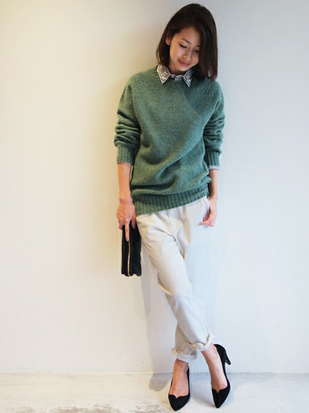 大人気の<by>コーデュロイパンツから、ホワイトをチョイスしたスタイリング。 優しい色合いのニットにシャツをインして、マニッシュな雰囲気の中に女性らしさを演出しました。 ブラックの小物で全体を引き締め、バランス良く纏めたコーディネート。