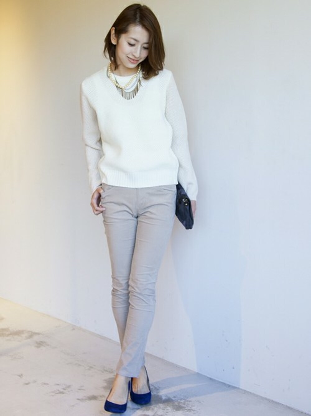 BYオリジナルのバイカラーニットをメインにコーディネートしました。 身頃と袖を配色で仕上げたスタイリッシュなデザインが個性的。 ウエアは優しい色合いにまとめ、重ね付けしたネックレスなど小物でアクセントをプラスしました♪