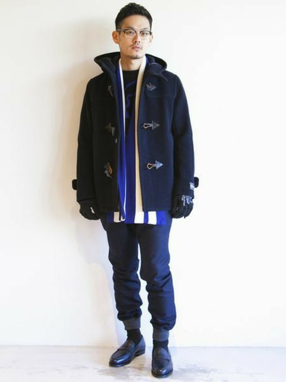 ダッフルコートをリブパンツできれい目に着崩しました。コートの中に使用したマフラーを挿し色にして、グローブとシューズを同色にすることで統一感を持たせました。