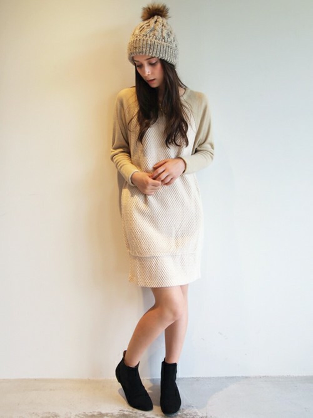 ぽこぽことした生地感がキュートなニットワンピスタイル。 淡い色使いが、女の子らしくキュートなカジュアルスタイルを演出してくれます。 冬らしいポンポンニットキャップを合わせて可愛くまとめました♪