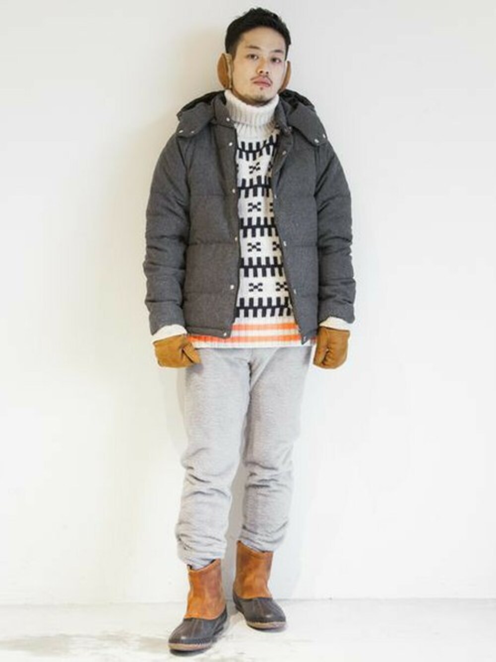 オリジナルのダウンジャケットをメインにウォーム感のあるスタイリング。小物の色を合わせて統一感を出したのもポイントです。