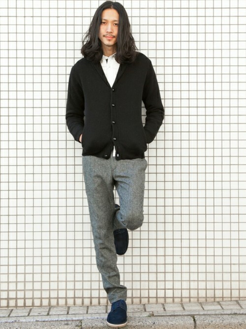 ショールカラーのカーディガンを冬素材のテーパードパンツであわせたシンプルなコーディネート。シンプルな分、シルエットにはとことん拘りました。