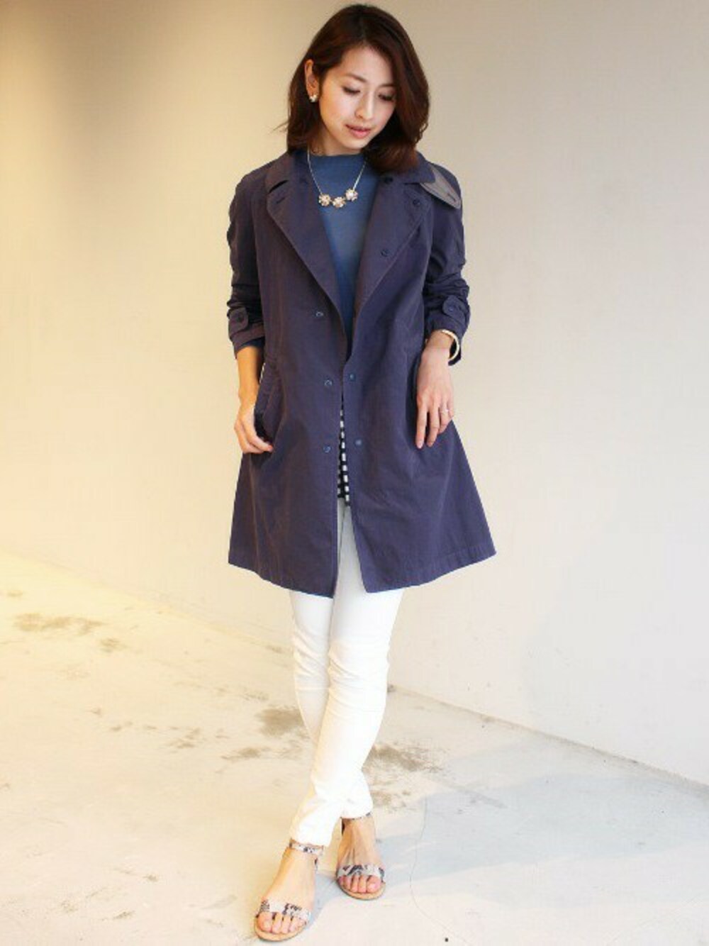 <NO ONE ELSE>の新作ステンカラーコートをメインにコーディネートしました。 緩やかなAラインシルエットが、メンズライクなアイテムに程良い女性らしさをプラスしています。 アウターの色味に合わせたトップスに、ホワイトのスキニーを合わせて春らしいトーンにまとめました。