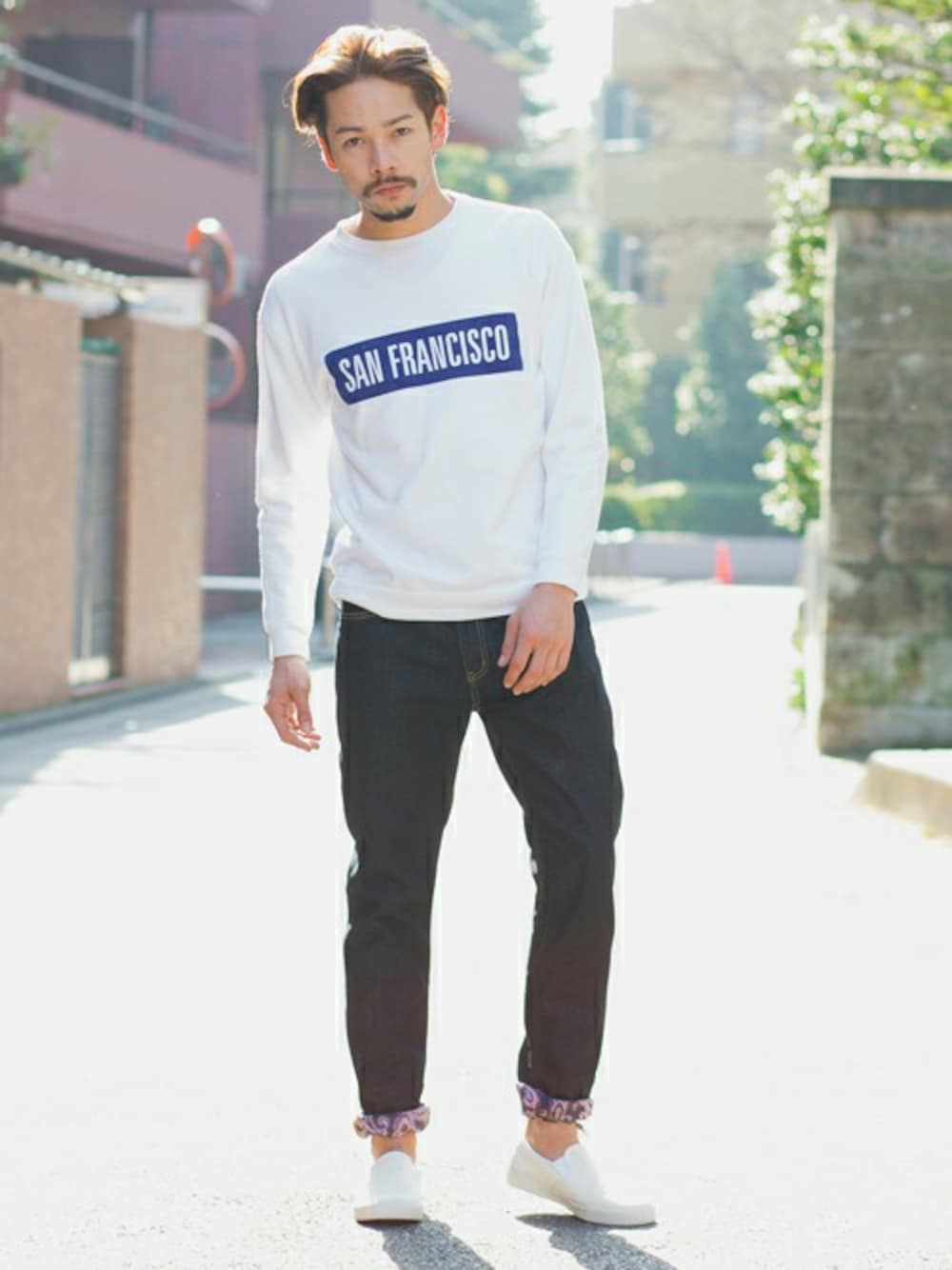 今シーズントレンドのスウェットを緩やかなテーパードパンツであわせました。すそをロールアップして軽さを演出したコーディネートです。