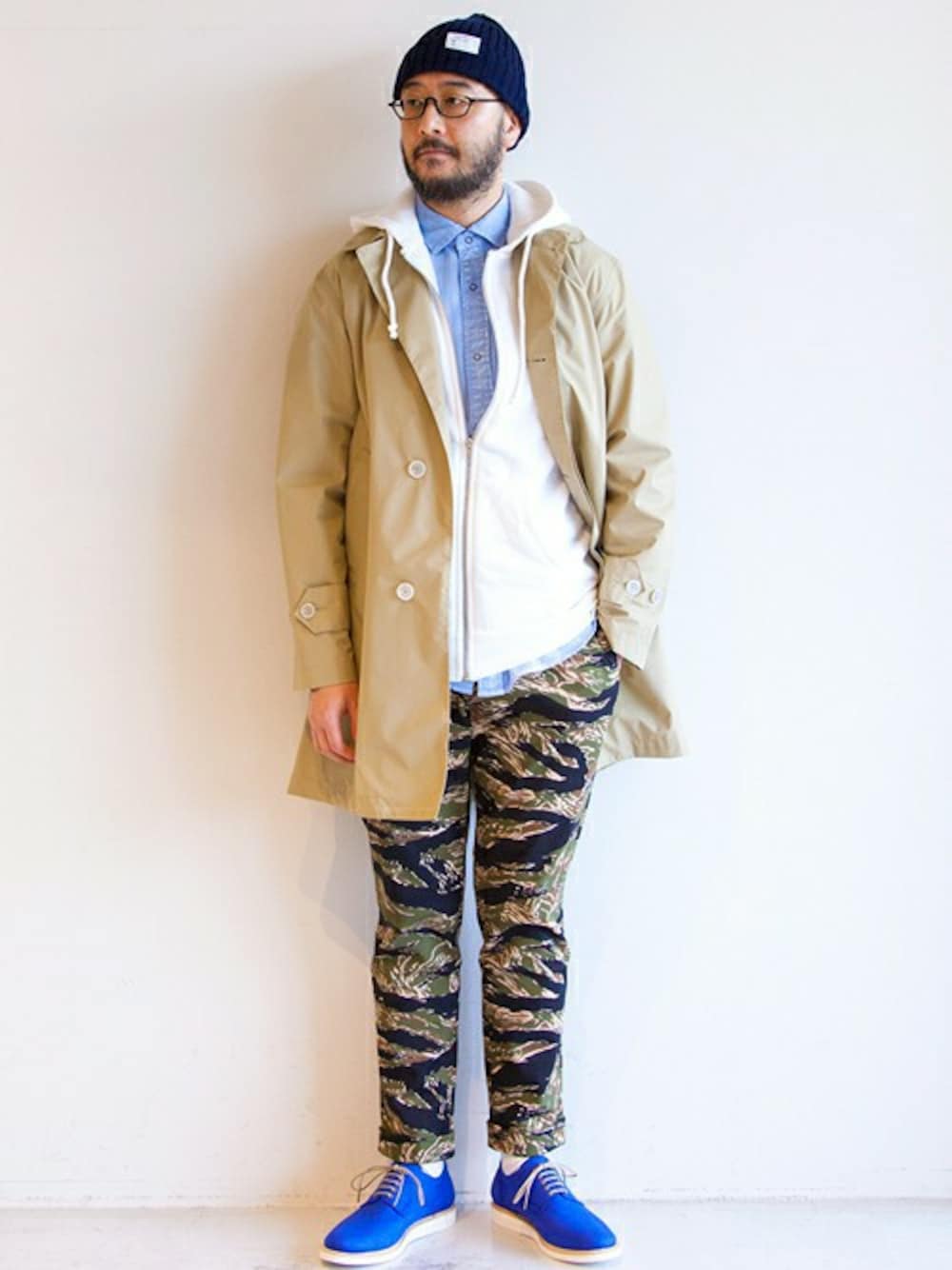 ステンカラーカラーのコートにカモフラージュ柄パンツを合わせて都会らしいスタイリングを表現。カラーリングもホワイト、ベージュ、ブルーでクールな印象にこだわりました。