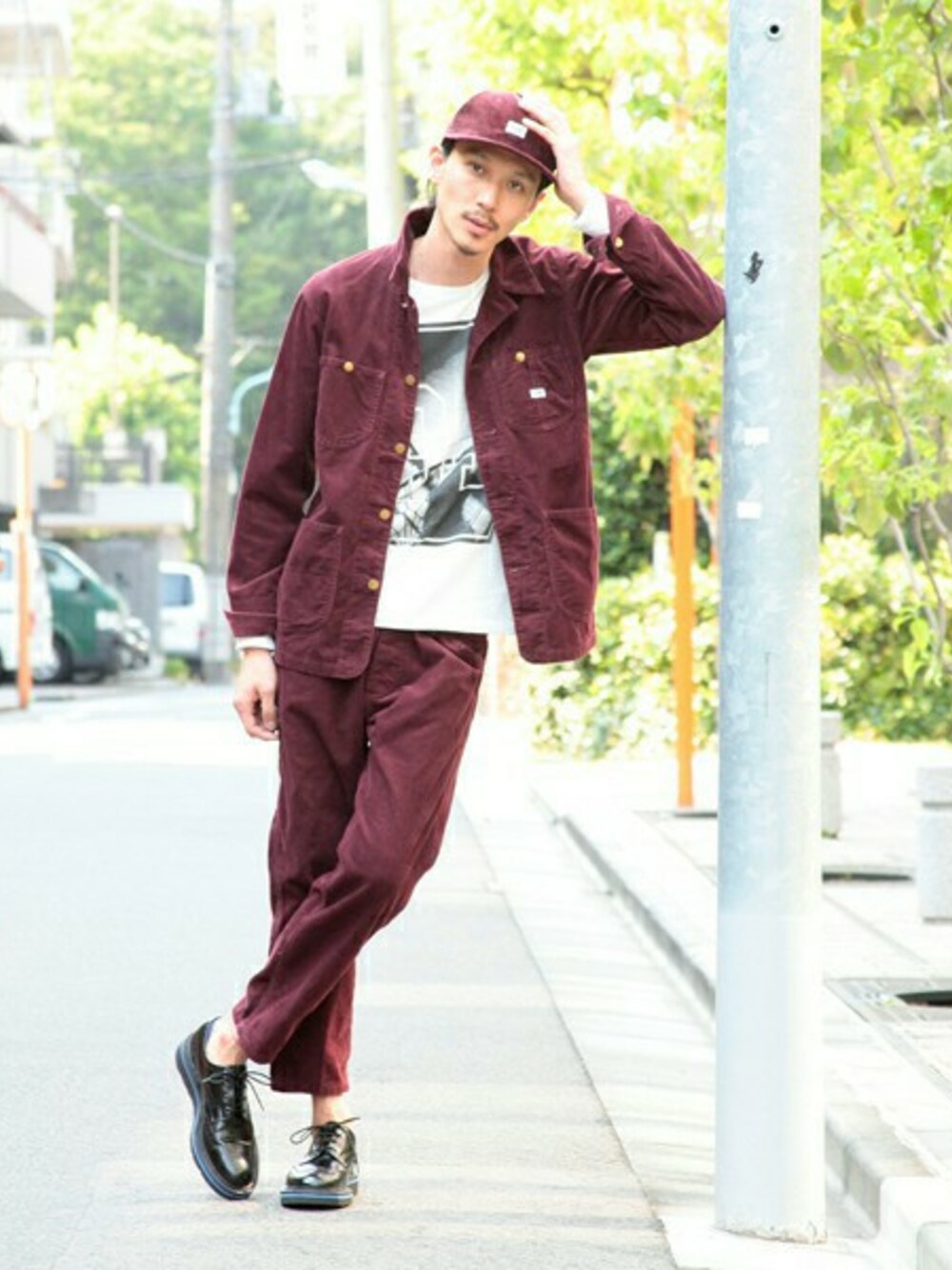 ワークテイスト溢れるセットアップをレザーシューズで合わせることで、きれい目な印象にコーディネート!キャップも同素材で揃えることで、統一感のあるスタイルになりました。