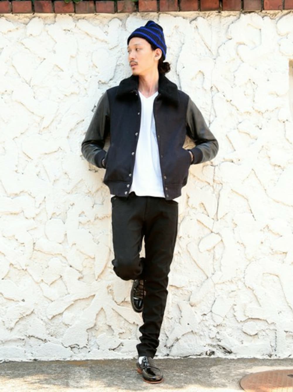 ネイビーのアワードジャケットをメインにコーディネート。小物の色も揃えて、カジュアルになりがちなアイテムを大人っぽく落ち着いたスタイルに仕上げました。
