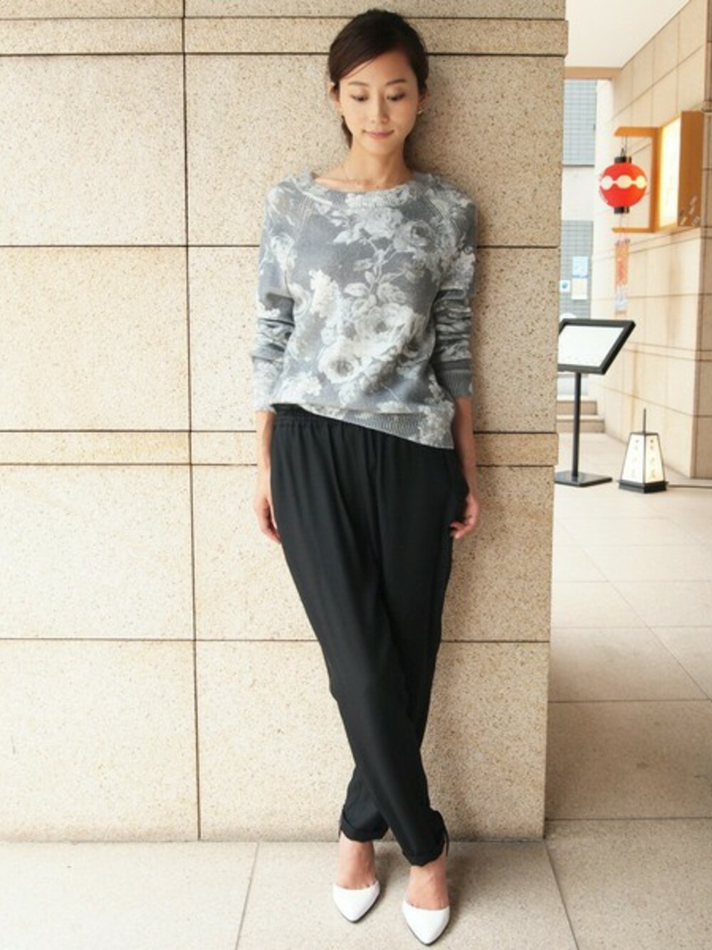 <O`2nd>のローズプリントニットをメインにスタイリングしました。 モノトーンカラーでシックにまとめつつ、エレガントな雰囲気が漂います。 リラックス感のあるパンツと合わせた、大人の余裕を感じるスタイリング。