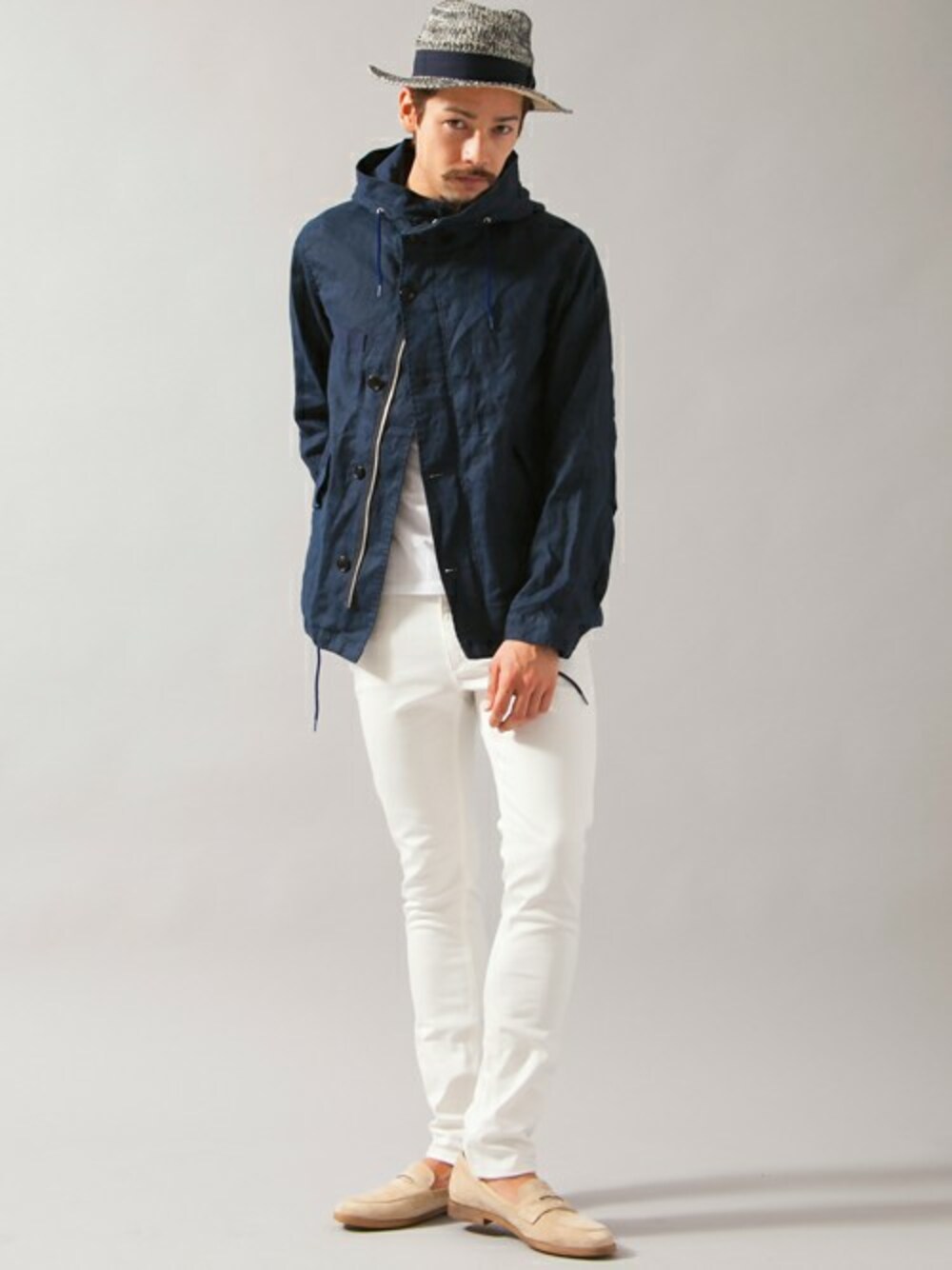 リネン素材のショートモッズをメインにコーディネート。ボリュームのあるトップスを引き立てるため、スキニーパンツで合わせました。ハットとシューズの色を揃えたのもポイントです。