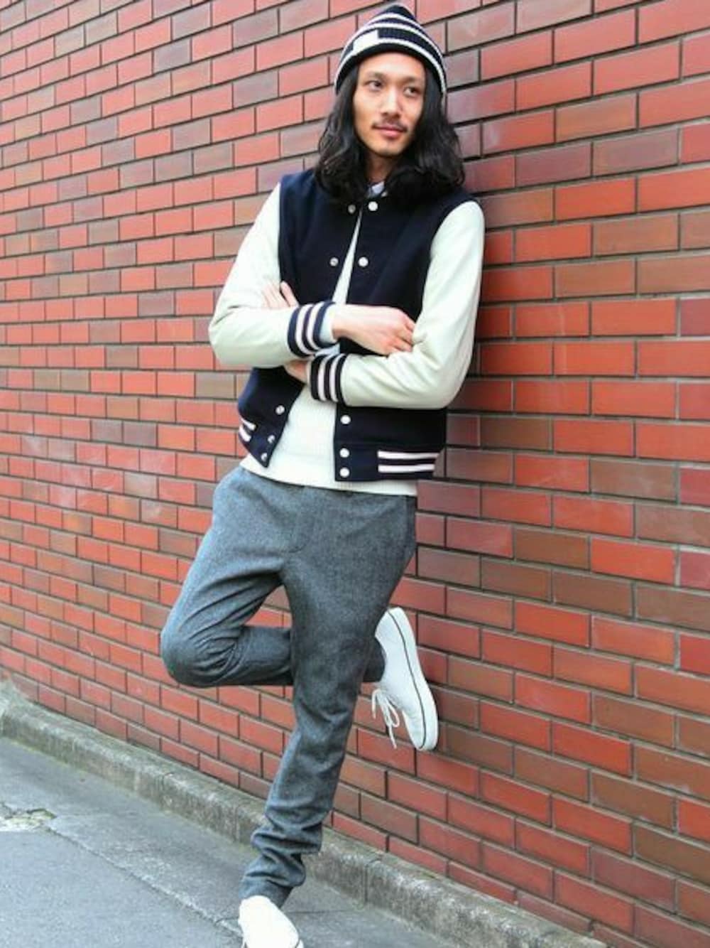 アワードジャケットをメインにコーディネート。インナーにアゼ編みのニット、冬素材のテーパードパンツを合わせることでトレンドも意識したスタイルです。