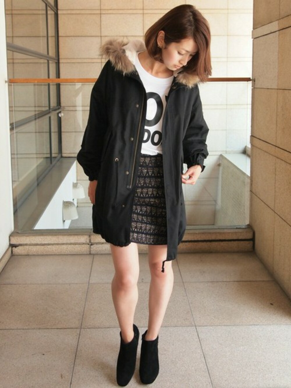 NET限定レーベル<by>のフィッシュテールライナーコートから、ブラックをチョイスしたコーディネート。 全体をモノトーン系にまとめ、繊細な柄デザインが魅力的な<Maison Olga>のタイトスカートをチョイスしてエレガントな雰囲気をプラスしました。