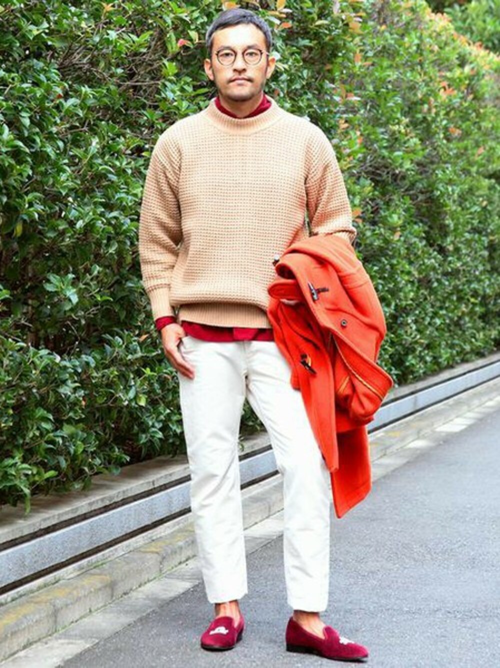 ニットスタイルを暖色でまとめてみました。パンツを白にしたことで、他のアイテムの色を主張でき、暗く、重く感じさせないように工夫。あくの強いルームシューズですが、シンプルになりがちなニットスタイルのアクセントに取り入れてます。 モデル : ビューティ&ユース 原宿メンズストア店 スタッフ