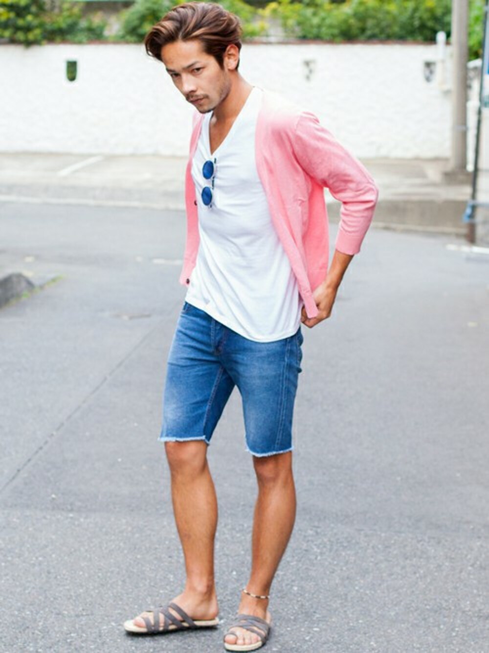 発色の良いピンクのカーディガンをメインにコーディネート。カットソーにさらっと合わせたシンプルなスタイリングだからこそ、サングラスやアンクレットなどの小物が引き立てます。