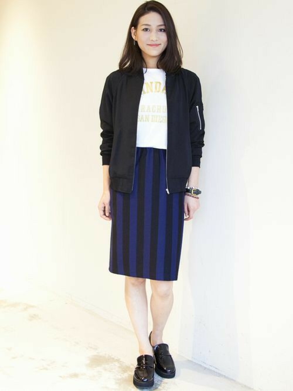 春アウターとしてオススメのMA-1を着用したコーディネート。 ボーイッシュになり過ぎないように、膝丈のタイトスカートを合わせました。 黒を基調としたアイテムセレクトでモードなミックススタイル。 モデル:ビューティ&ユース プレス