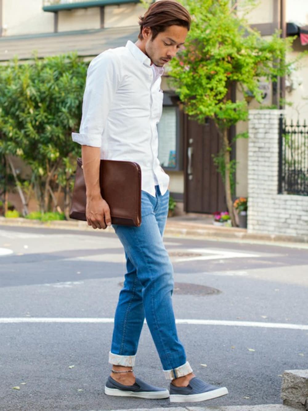 今シーズンお勧めのロールアップデニムにオックスフォードシャツを合わせたシンプルなコーディネート。シンプルな分、小物使いやシルエットに拘ったスタイリングです。