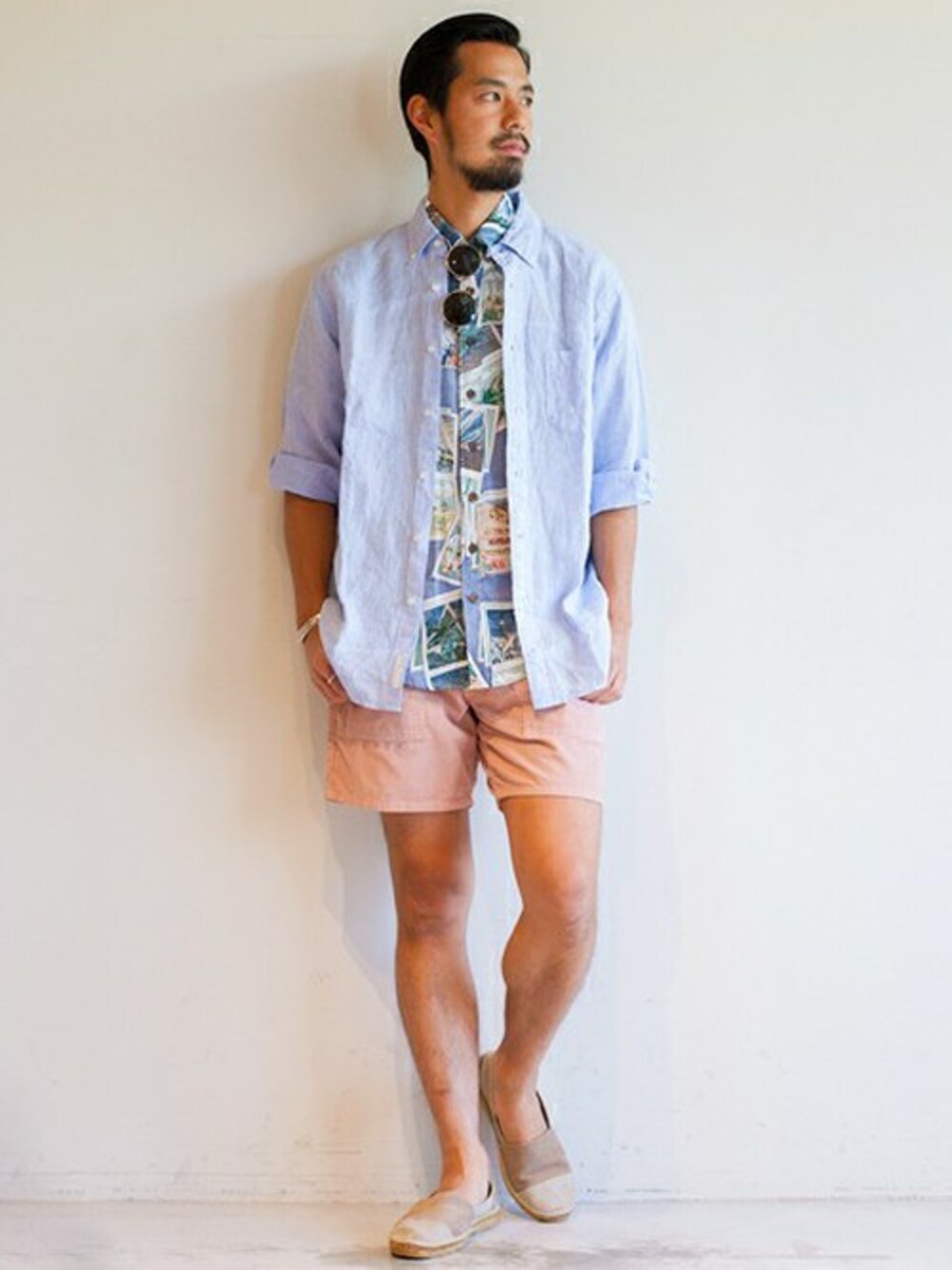 全体を淡いカラーで統一し、リラックス感のあるリゾートスタイルを演出。毎シーズンご好評いただいている<reyn spooner> for <BEAUTY&YOUTH>のアイテムとシャツを2枚重ねしたところもポイントです。
