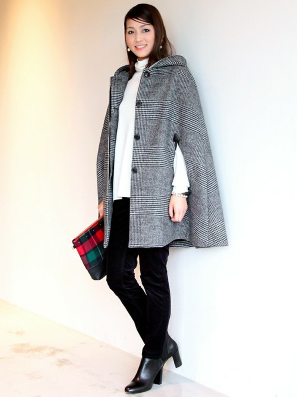 トラッドなチェック柄ポンチョをメインにコーディネートしました。 肌寒くなってきた今の時期にオススメの一着です♪ 他アイテムはシンプルにまとめ、トレンドのクラッチバッグもチェックをチョイスしてワンポイントにしました。 モデル : ウィメンズプレス