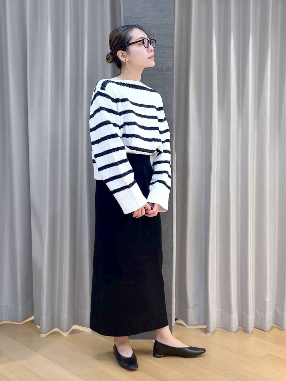 【ニット】 普段ボーダーを着ない人にも来て欲しい❣️ 普段、ボーダーを着る人には絶対来て欲しい✨ 素肌に着たいほど柔らかいお素材なのも💯 開きすぎていないネックラインの 絶妙な女性らしさ‼️‼️ 袖のボリュームと短めの丈感で、 スタイルUPと絶対な女性らしさ✨✨ ボーダーの感覚やデザインも素敵です🌼 【スカート】 シルクをブレンドした大人スカート🫶 ウエストはゴムでストレッチ性のある素材。 足さばきが良くお車に乗る方にも履きやすいです! ゆるっとしたトップスとの合わせが今年らしく カジュアルなアイテムとも相性抜群です🌼