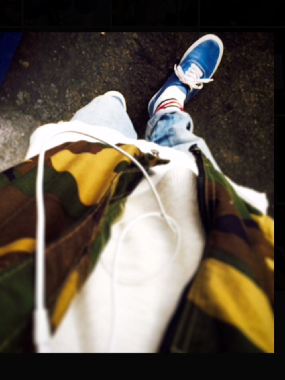 ロング丈の白Tに、サーマルTにカモフラのナイロンJKT着てパンツはlevis517を裾のフレアを少し切ってロールアップして、ラインソックスにUSのVANS
