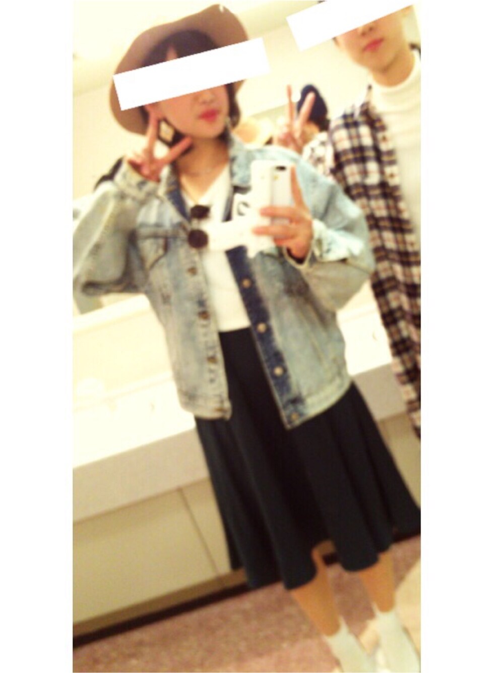 プチプラコーデです ケミカルデニムも スカートも 古着屋さんで買った 古着屋さんむりって人おおいけど わたしわぁ味が出てていいなーって おもいます♡ ちなみに 帽子もサングラスもピアスも 400円弱です プチプラ いいかんじ
