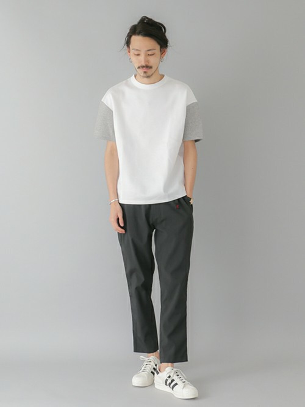 今期の人気アイテムであるポンチ素材のルーズTシャツ。パンツはグラミチで全体的に動きやすいコーディネートです。