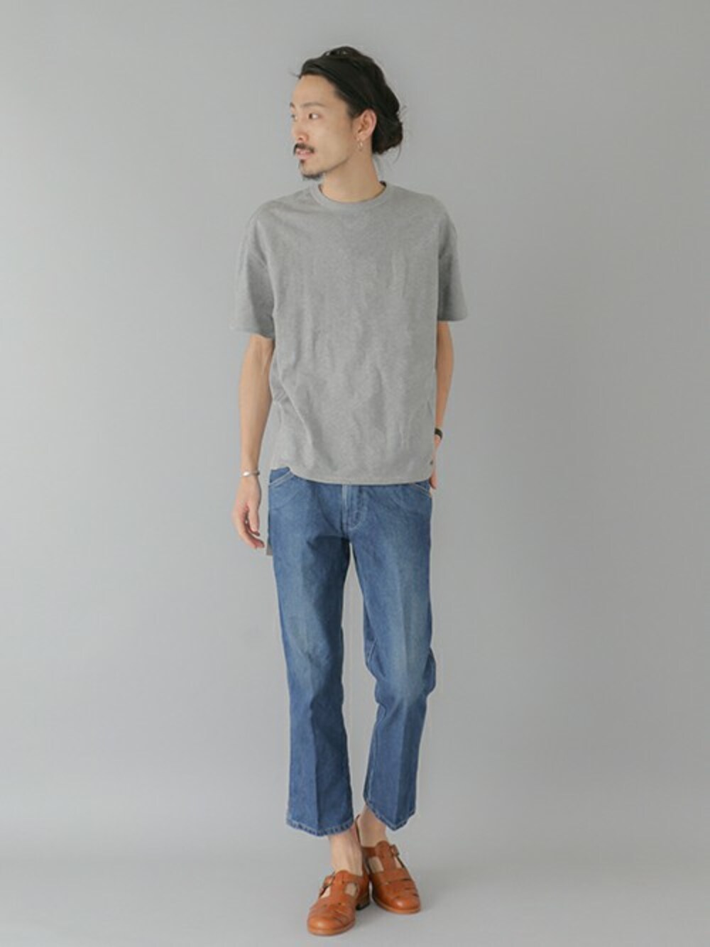 フレアデニムとグルカサンダルでトレンド感をプラス。