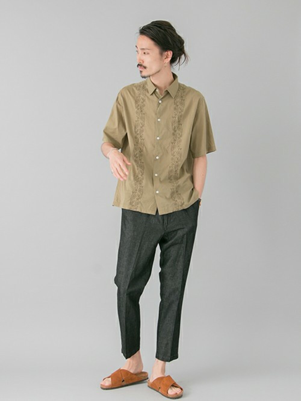 カーキに刺繍を施したシャツが今の気分にストライク。