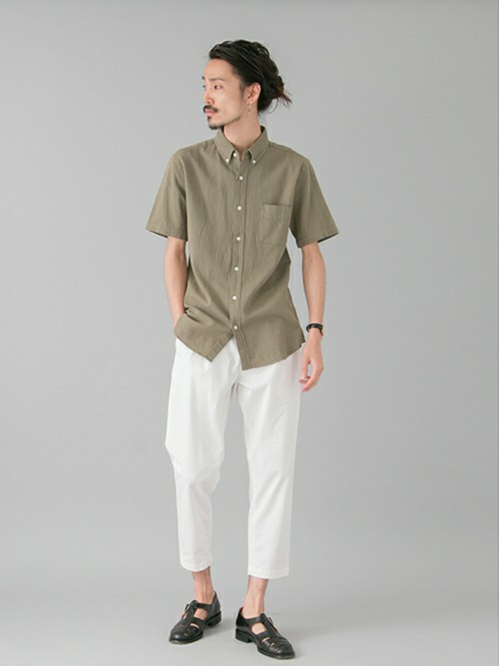 定番のシャツでもカーキを選ぶとトレンド感UP。