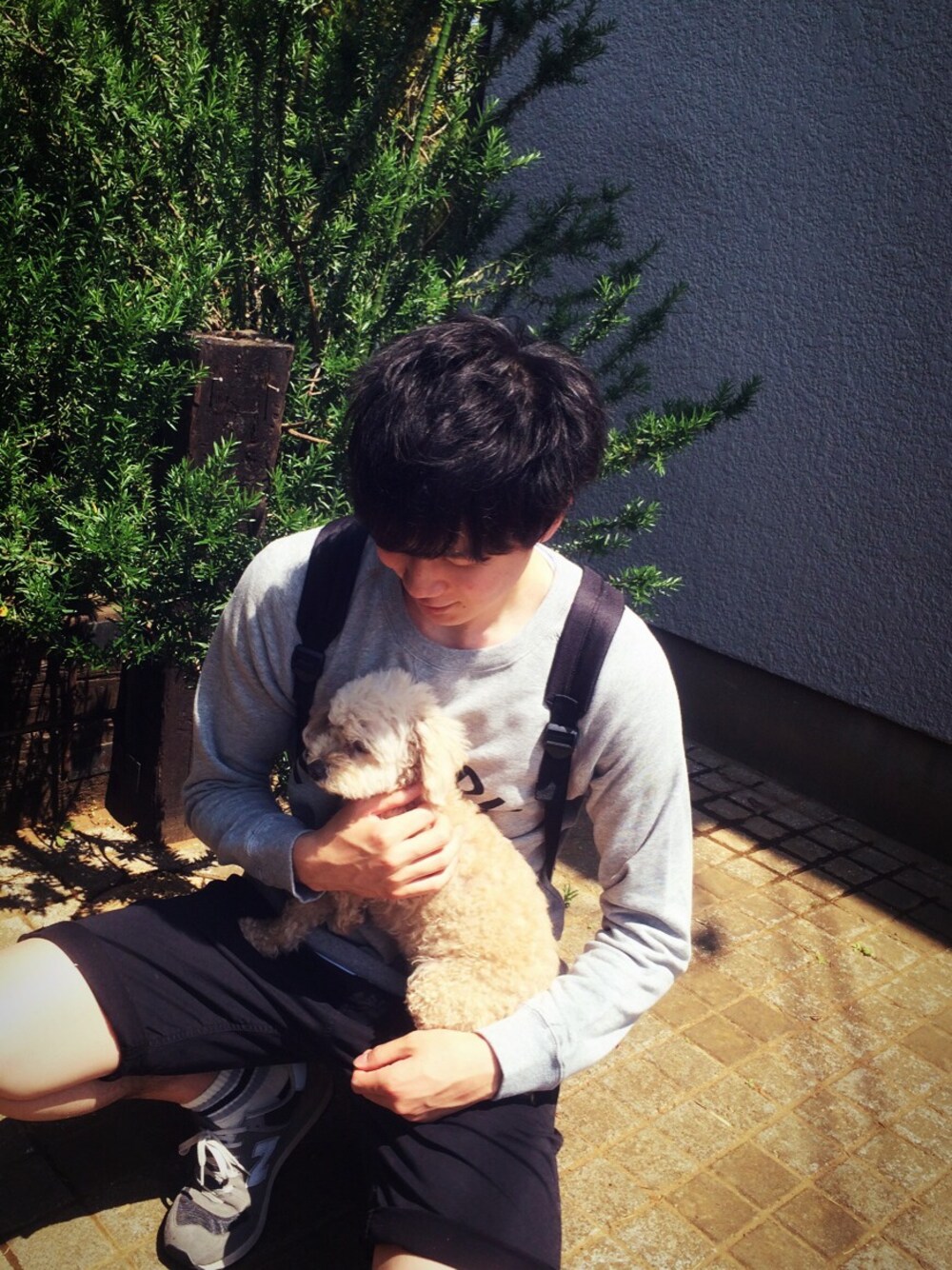 大きめのスウェットシャツをハーフパンツとニューバランスでカジュアルに着用。愛犬と一緒に撮りました!名前はモコ。