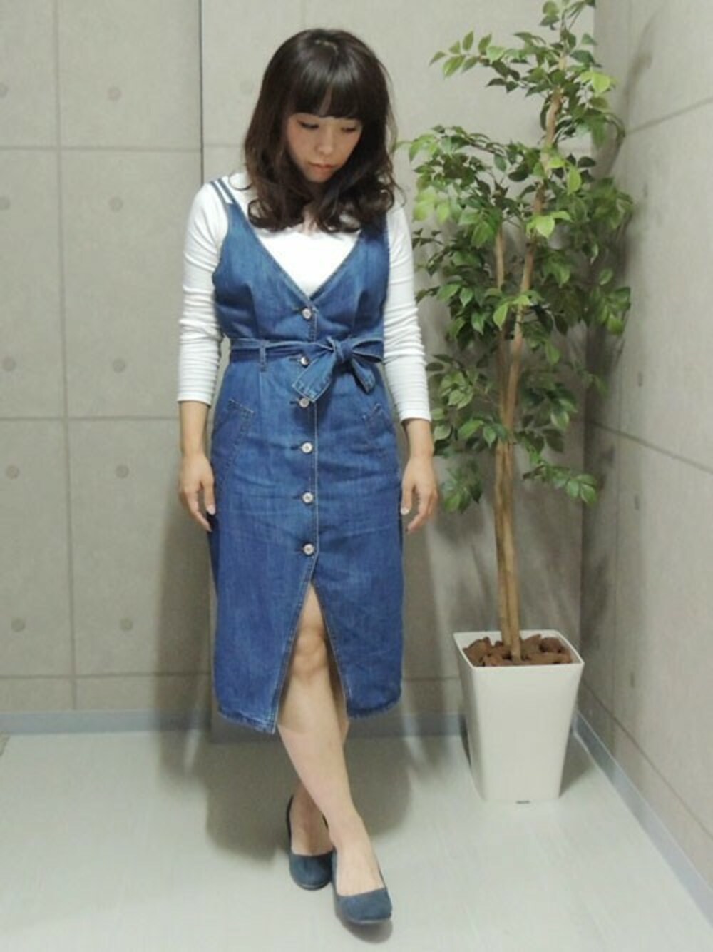 デニムワンピースとデニムプリントのパンプスで、デニムonデニム☺ インソールが厚みのある高反発クッションで履き心地が良く、どんどん歩けるパンプスです♪