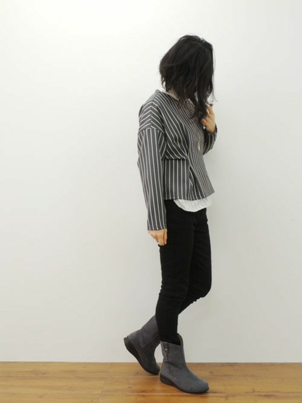 シンプルなブーツは履き回し抜群☆ このブーツは正面から見ると履き口がVカットになっているので、 すっきり脚長効果が期待できます♪ 内側の一部には吸湿発熱加工素材が使われていて あったかいのも嬉しいポイントです!