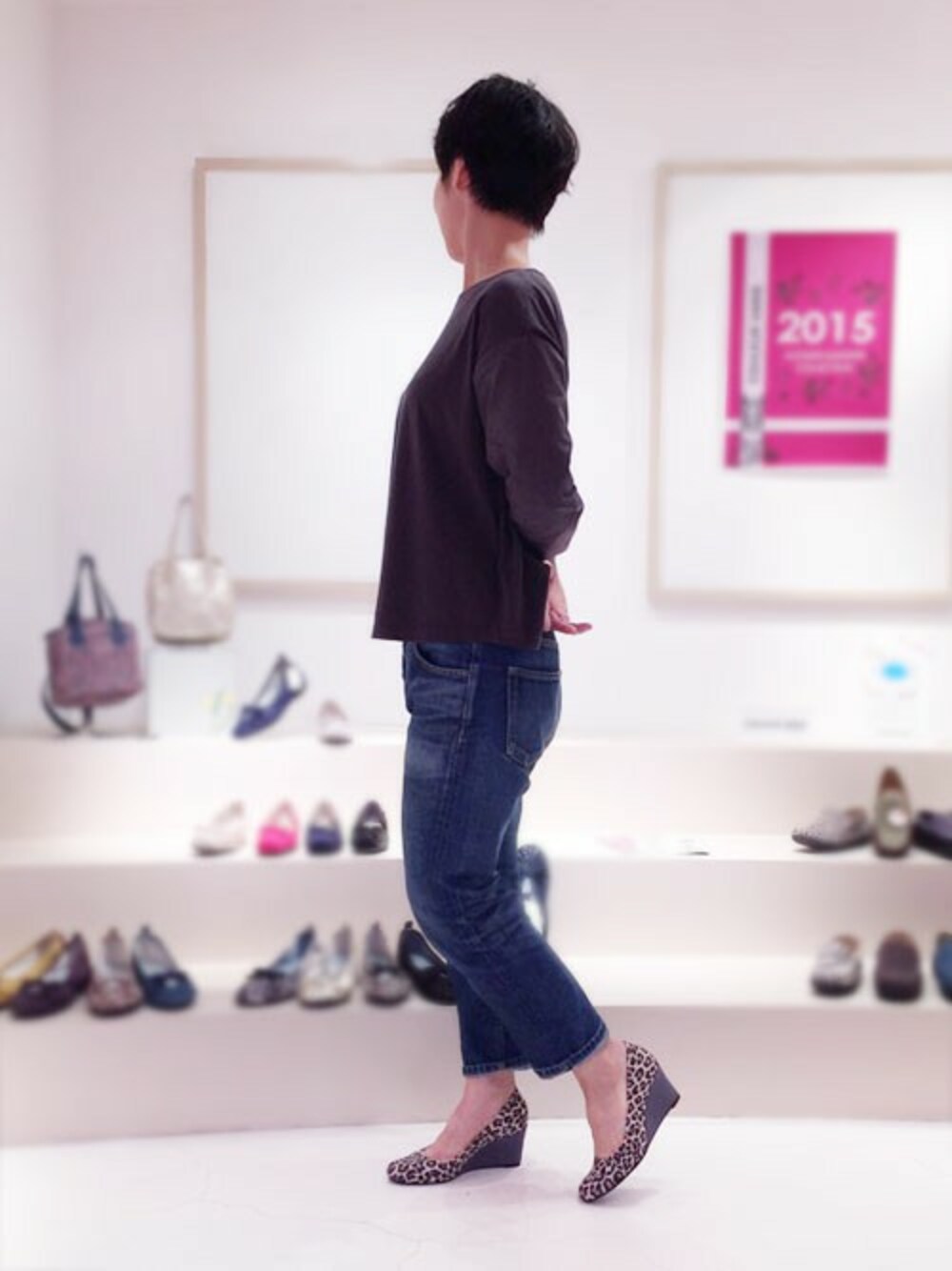 シンプルなカジュアルコーデにポイントでヒョウ柄のパンプスを履きました♪ 柄物は意外と合わせやすくて◎ 少し高めの7cmヒールだけどウェッジソールなので安定感抜群です‼