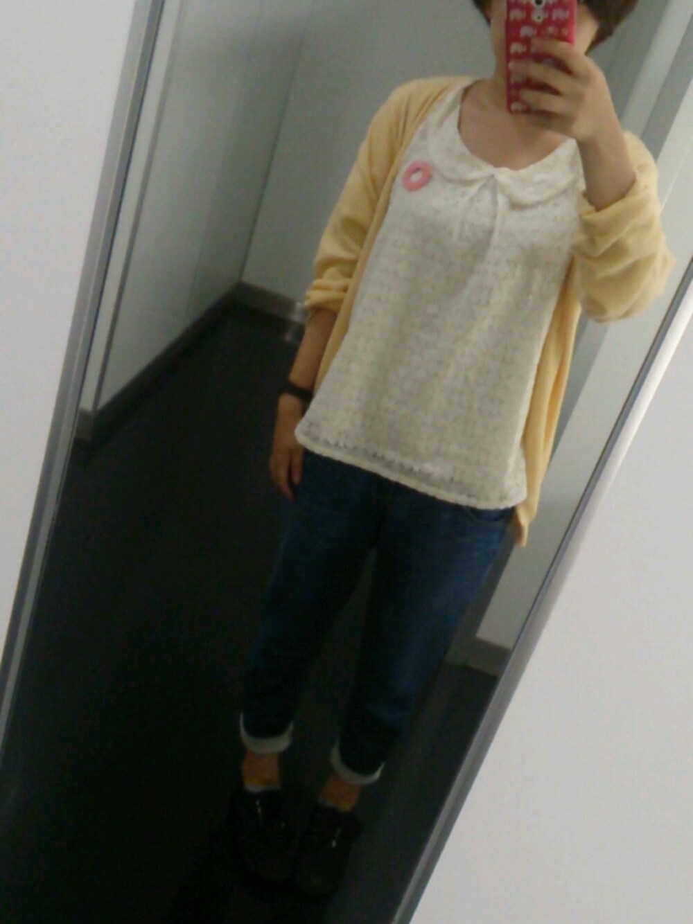 昨日の服。 古着のトップスです。 パンツはデニムに見えるけど、 実はこれスウェット素材なんです。 はきやすくてらくちんです。 あ、あとデザフェスで買った へんてこブローチ。 おきにいりです。