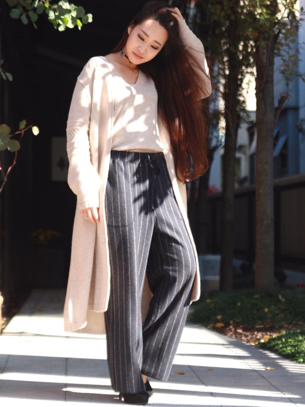 こんばんは⭐️ 今日はポカポカした1日でしたね😊 寒いのが苦手だから過ごしやすくて嬉しかったですー🤗🌼 そんな今日はまたも大好きなロングカーデを着ちゃいました🙀💗 白×白で 新作のストライプワイドパンツを主役に⭐️ この全体的にゆるっとした感じにチョーカーでアクセントした感じが好きです😌💞