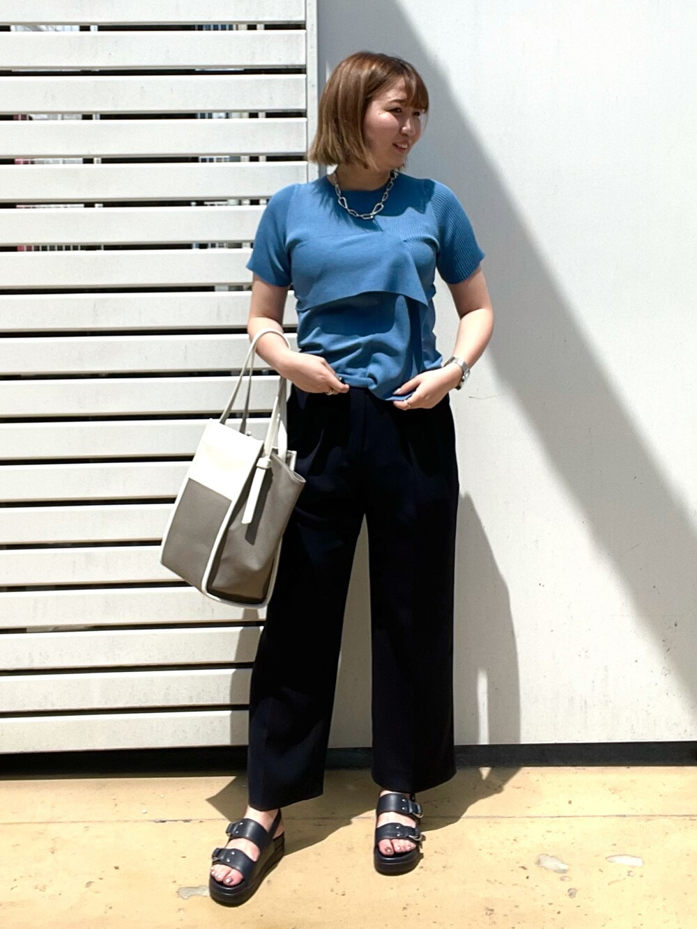 主役はパッと目を惹くブルーのニット。CAST:らしいフロントデザインがポイント✨程よい丈でパンツもスカートにも合わせられます◎ネイビーのセミワイドパンツとサンダルでコーディネートを締めました◎ブルー✖︎ネイビーの相性は間違いなし!おすすめです✨