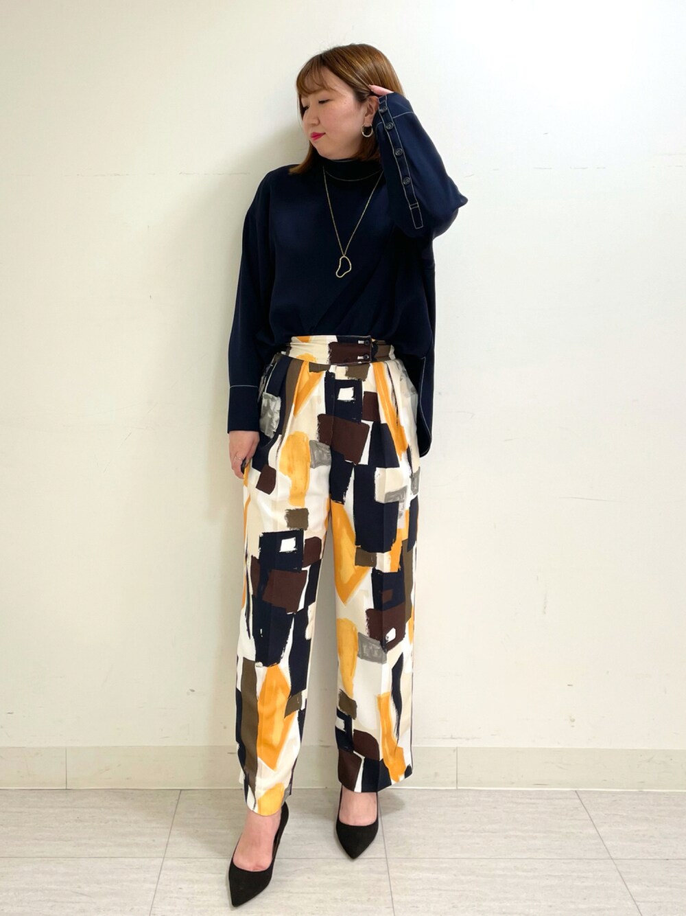 毎回完売必須の大人気バックボタンシャツ。プリントパンツに入っているネイビーに合わせてシャツはネイビーをセレクトしました。お仕事にも送り迎えにも着用できる万能ネイビー◎コーディネートを締めてくれるので、スタイルアップも✨どちらも着心地もサラッとしており、初秋〜冬まで楽しんでいただける鉄板おすすめコーディネートです!パンツは大人気の5カラーズパンツと同じ形のセミワイドパンツ。足のラインを拾わずストンと落ち感のあるシルエットが綺麗なパンツ。色んな色が入っているので色合わせもしやすいです✨